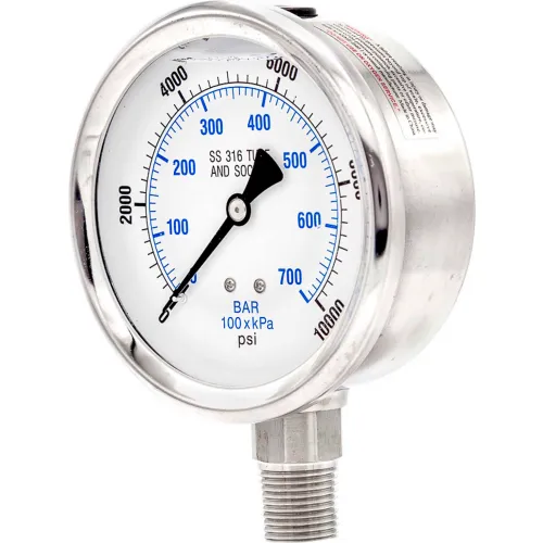Pic Gauges 4" Pressure Gauge, Liquid Fill, 10000 PSI, All Stainless Steel, Lower Mount, 301L-402U