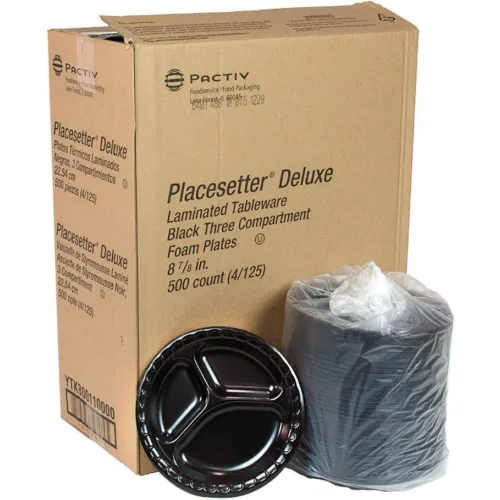 Pactiv Evergreen Placesetter Deluxe 3-Compartment Dinnerware Plates, 9" Dia., Black, 500/Carton