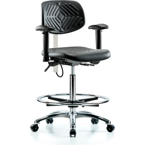 Blue Ridge Ergonomics Polyurethane ESD High Bench Chair with Foot Ring, Adjustable Arms, Black