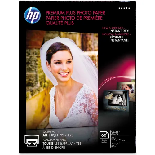 HP Premium Plus Photo Paper, 5" x 7", White, 60 Sheets/Pack