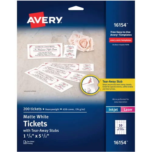 Avery® Printable Tickets w/Tear-Away Stubs, 8.5" x 11", White, 10 Tickets/Sheet, 20 Sheets/PK