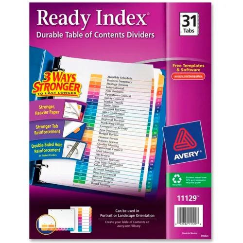 Avery® Customizable TOC Ready Index Multicolor Tab Dividers, 31-Tab, 1 to 31, 11" x 8.5"