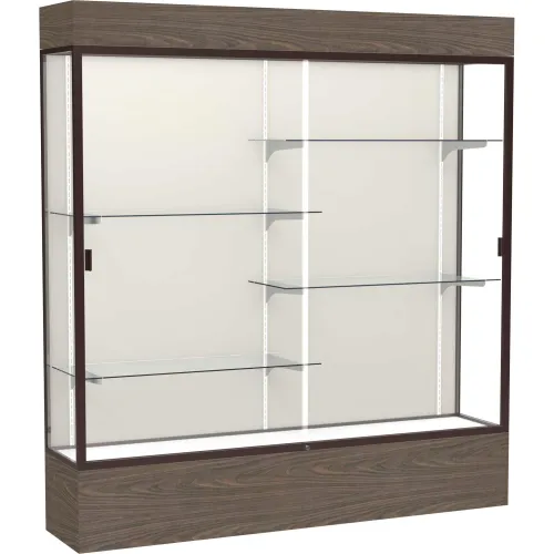 Reliant Lighted Display Case 72"W x 80"H x 16"D Walnut Base Plaque Back Dark Bronze Frame