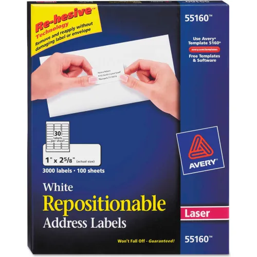 Avery® Repositionable Address Labels for Laser Printers, 1 x 2 5/8, White, 3000/Box