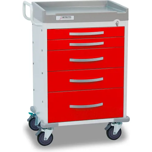 Detecto® Rescue Series Emergency Room Medical Cart, White Frame with 5 Red Drawers
