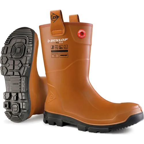 Dunlop RigPro Purofort Safety Mid-Calf Boots, Cleated Outsole, Steel Toe, Size 6, 10"H, Light Brown
