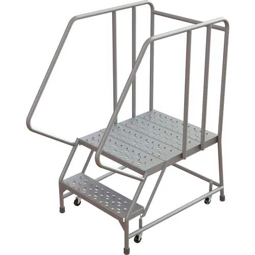 Tri-Arc Rolling Ladder, 2 Step, Aluminum, Perforated, 28" Deep Top Step, With Handrails, 24"W Step