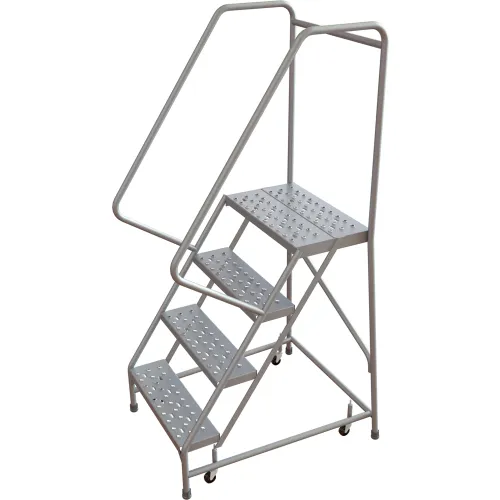 Tri-Arc Rolling Ladder, 4 Step, Aluminum, Perforated, 14" Deep Top Step, With Handrails, 24"W Step