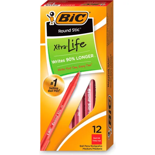 BIC® Round Stic Xtra Life Ballpoint Pen, Stick, Medium 1 mm, Red Ink, Dozen