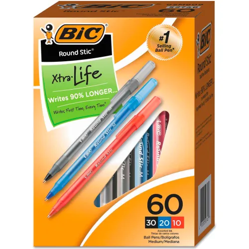 BIC® Round Stic Xtra Precision Stick Ballpoint Pen, 1mm, Assorted Ink/Barrel, 60/Pack