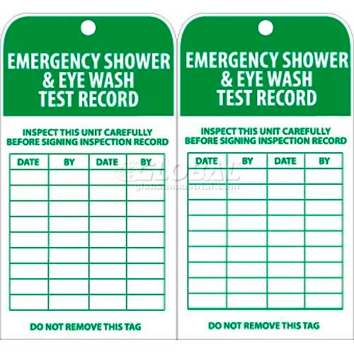 NMC RPT37 Tags, Emergency Shower And Eye Wash Test Record, 6" X 3", White/Green, 25/Pk