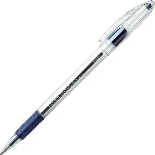 Pentel® RSVP Ballpoint Stick Pen, Fine, Clear Barrel, Blue Ink, Dozen