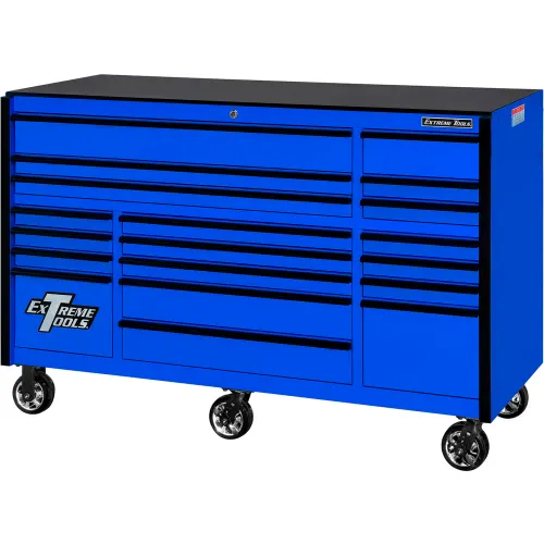 Extreme Tools RX Roller Cabinet, 19 Drawers, 72"W x 30"D x 47"H, Blue with Black Drawer Pulls