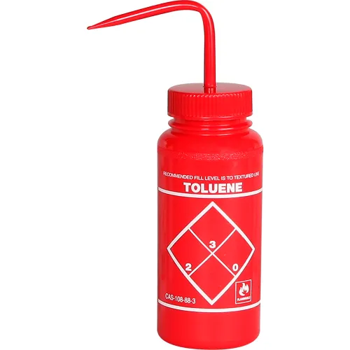 Bel-Art Safety-Labeled 2-Color Toluene Wide-Mouth Wash Bottles, 500ml (16oz), PE w/Red PP Cap, 6Pk