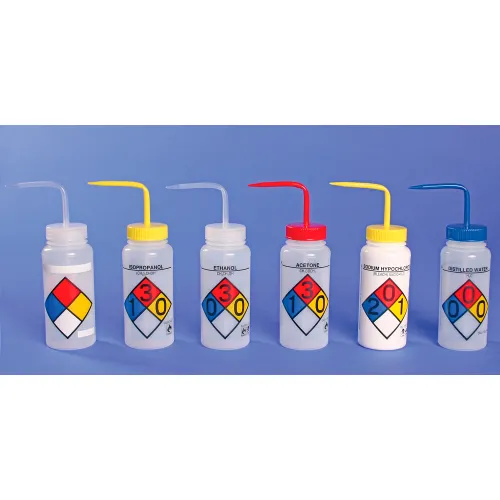 Bel-Art Safety-Labeled 4-Color Ethanol Wide-Mouth Wash Bottles, 1000ml (32oz), PE w/Nat PP Cap, 4Pk