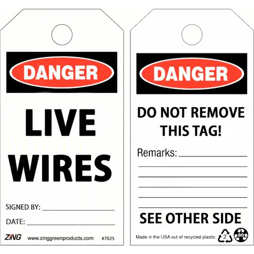 Zing Safety "Live Wires" Text Lockout Tags, 3"W x 1/2"D x 5-11/16"H, Red/Black/White, Pack of 10