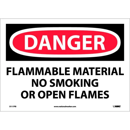NMC Signs w/ Safety Message, Flammable Material No Smoking, 1/10 Mil Thick, 14"W x 10"H