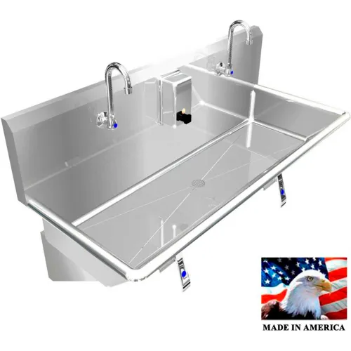 BSM Inc. Stainless Steel Sink, 2 Station w/Knee Operated Faucets, Wall Mounted 48" L X 20" W X 8" D