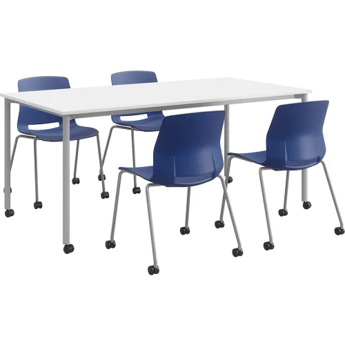 KFI Steel Frame White Table on Casters 72"W x 36"D x 31-3/4"H with 4 Navy Poly Chairs