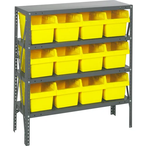 Quantum 1239-SB807 Steel Shelving with 12 8"H Plastic Shelf Bins Yellow, 36x12x39-SB4 Shelves