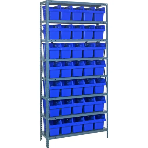 Quantum 1275-SB802 Steel Shelving with 35 8"H Plastic Shelf Bins Blue, 36x12x75-SB8 Shelves