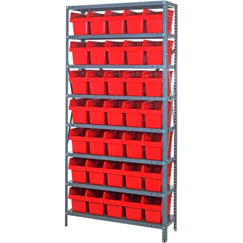 Quantum 1875-SB804 Steel Shelving with 35 8"H Plastic Shelf Bins Red, 36x18x75-SB8 Shelves