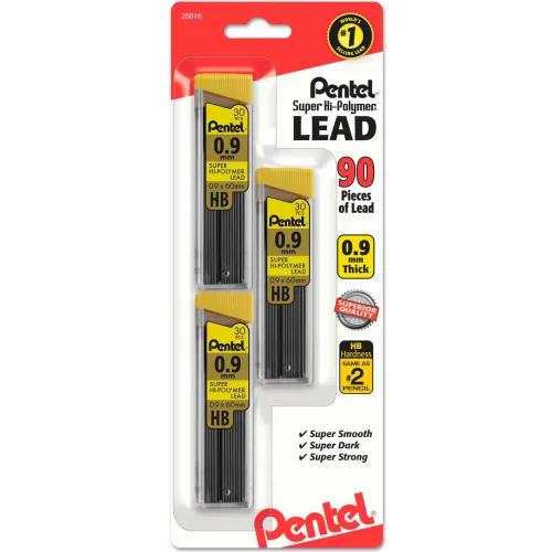 Pentel® Super Hi-Polymer Lead Refills, 0.9 mm, HB, Black, 30/Tube, 3 Tubes/Pack