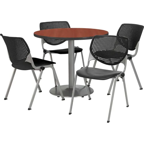 KFI 36" Round Dining Table & Chair Set, Mahogany Table With Black Plastic Chairs