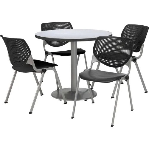 KFI 42" Round Dining Table & Chair Set, Gray Table With Black Plastic Chairs