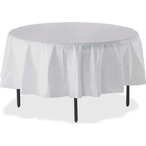 Genuine Joe® GJO10330, Round Tablecover, 84"W x 84"L, Plastic, White, 6/Pack