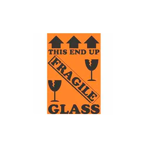 "This End Up Fragile Glass" Labels, 6"L x 4"W, Fluorescent Orange & Black, Roll of 500