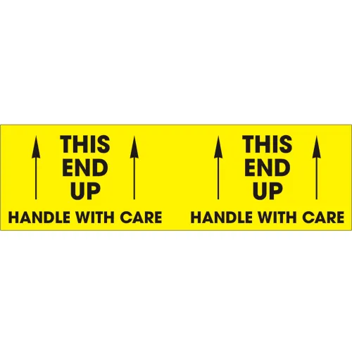 "This End Up Handle w/ Care" Labels, 3"L x 10"W, Bright Yellow & Black, Roll of 500