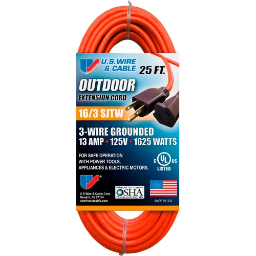 U.S. Wire 60025 25 Ft. Three Conductor Orange Extension Cord, 16/3 Ga. SJTW-A, 300V, 13A