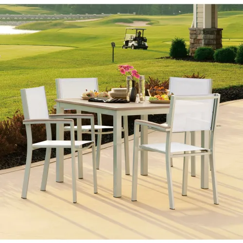 Oxford Garden® Travira 40" Square Dining Set, 4 Armchairs, Natural Sling/Vintage Top