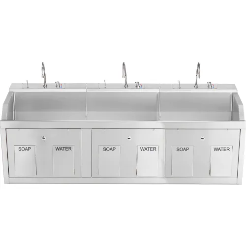 Blickman Triple Station Wall Mounted Lodi Scrub Sink, Knee Action Control, Stainless Steel