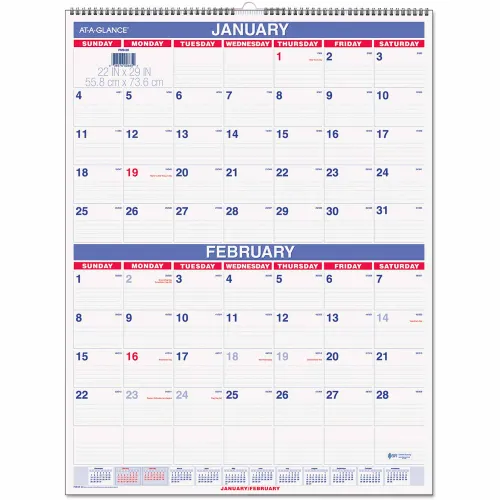 AT-A-GLANCE® Two-Month Wall Calendar, 22 x 29, White/Blue/Red Sheets, 12-Month (Jan to Dec): 2026