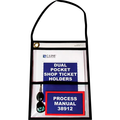 C-Line Products Two-Pocket Shop Ticket Holder w/Hanging Strap, Stitched, Clear, 9 x 12, 15/BX