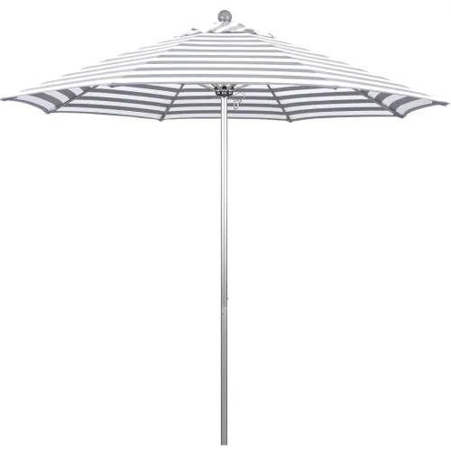 California Umbrella 9' Patio Umbrella, Venture Series, Silver Pole, Olefin Gray/White Cabana Stripe