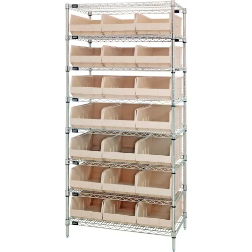 Quantum WR8-425 Chrome Wire Shelving with 21 SSB425 Stackable Shelf Bins Ivory, 36x12x74