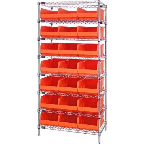 Quantum WR8-425 Chrome Wire Shelving with 21 SSB425 Stackable Shelf Bins Orange, 36x12x74