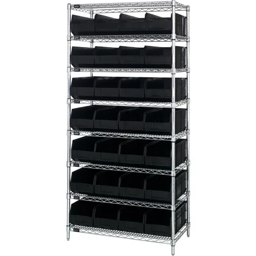 Quantum WR8-443 Chrome Wire Shelving with 28 SSB443 Stackable Shelf Bins Black, 36x14x74