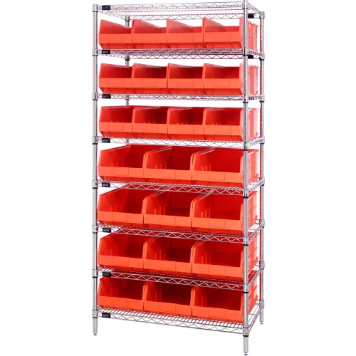 Quantum WR8-483485 Chrome Wire Shelving w/12 SSB483, 12 SSB485 Stackable Shelf Bins Orange, 36x21x74