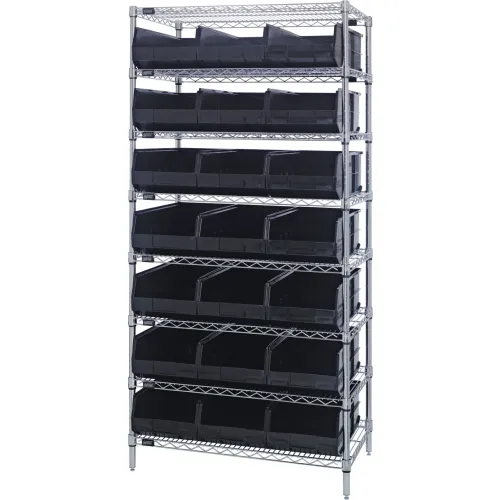 Quantum WR8-485 Chrome Wire Shelving with 21 SSB485 Stackable Shelf Bins Black, 36x21x74
