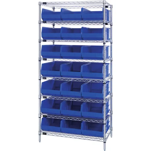 Quantum WR8-485 Chrome Wire Shelving with 21 SSB485 Stackable Shelf Bins Blue, 36x21x74
