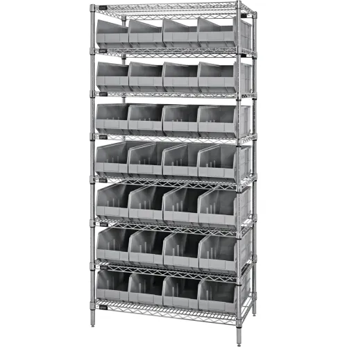 Quantum WR8-483 Chrome Wire Shelving with 28 SSB483 Stackable Shelf Bins Gray, 36x21x74