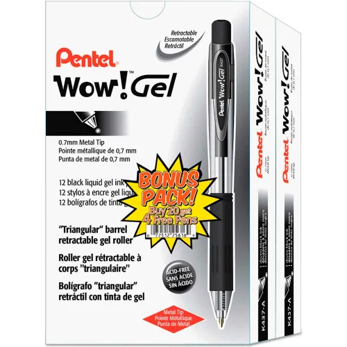 Pentel® WOW! Retractable Gel Pen, Medium 0.7mm, Black Ink, Clear/Black Barrel, 24/Pack